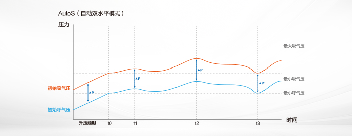 AutoS 双水平全自动调压模式,根据睡眠呼吸事件发生次数,自动调节呼气压力和吸气压力,治疗有效舒适。